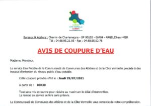Accueil > Non classé > Coupure d’eau aura lieu le Jeudi 29 Juillet 2021 à partir 08h30 > Avis de coupure d’eau Jeudi 29 Juillet 2021 à partir de 8h30 à MONTESQUIEU