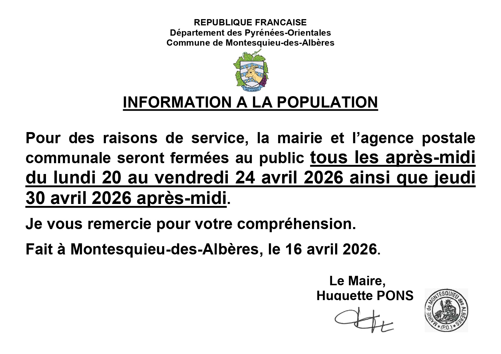 LA MAIRIE COMMUNIQUE SUR UNE MODIFICATION PONCTUELLE DES HORAIRES D’OUVERTURE AU PUBLIC (17/04/2026)